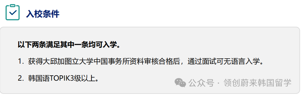 韓國大邱加圖立大學(xué)   雙語授課專升本、專升碩   2026年9月入學(xué)批次火熱申請中,想要了解更多關(guān)于韓國留學(xué)相關(guān)信息,可以添加董老師微信咨詢哦~